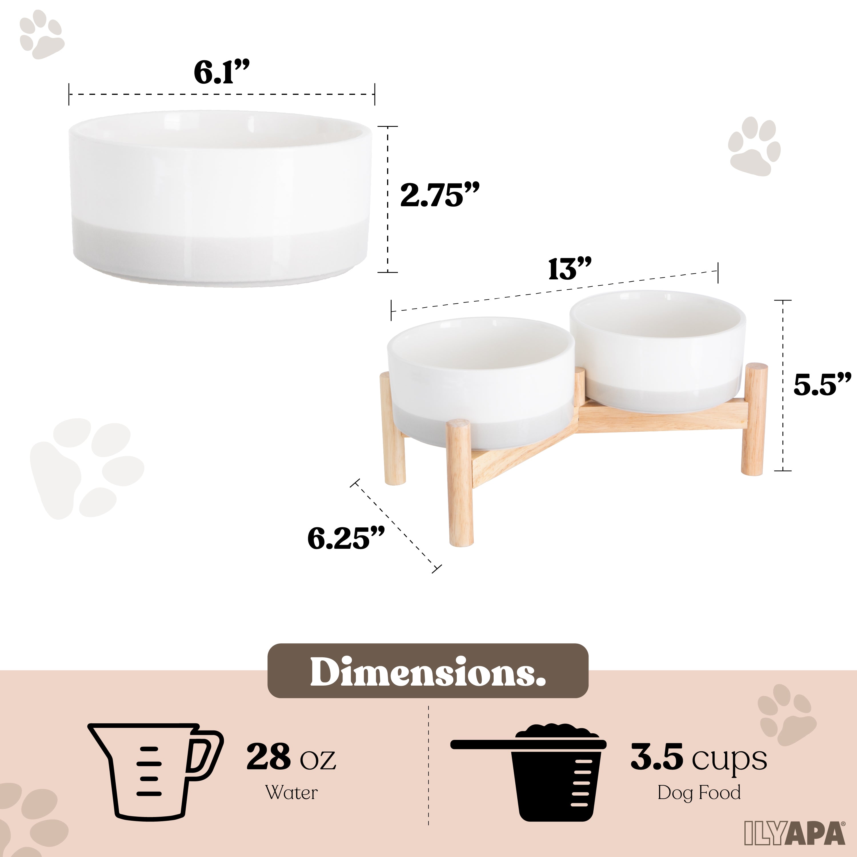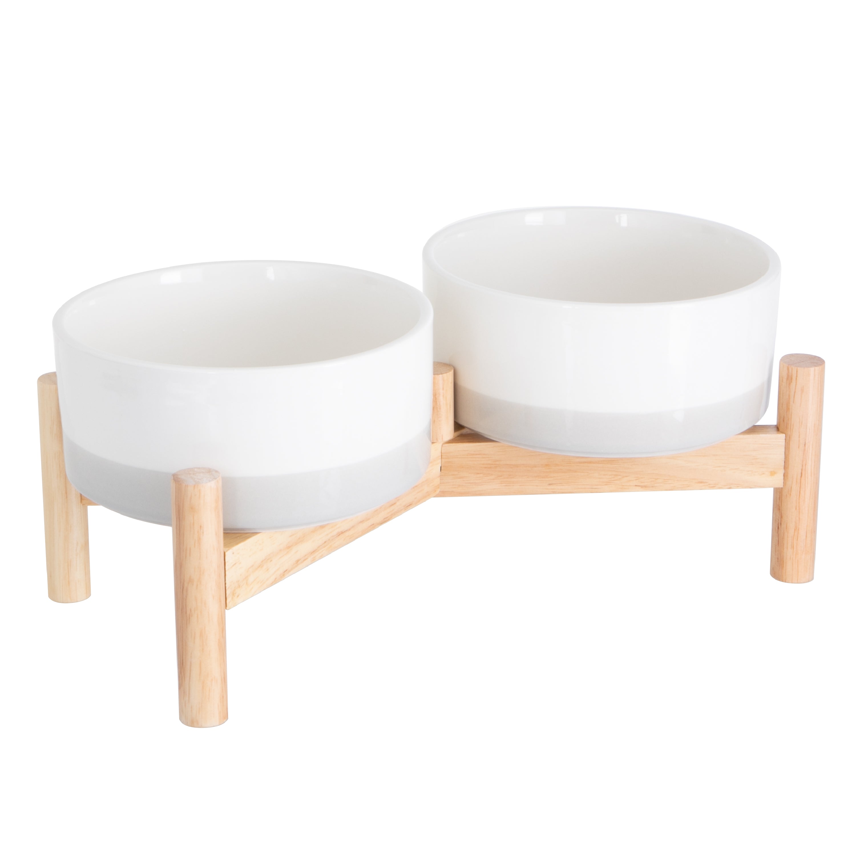 Ceramic Dog Bowls - Elevated for Medium Sized Pet with Raised Food and Water Set - Gray Double 6 inch, 28 Oz Bowls & 13x6.3x5.5 Wooden Stand